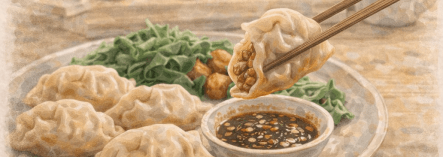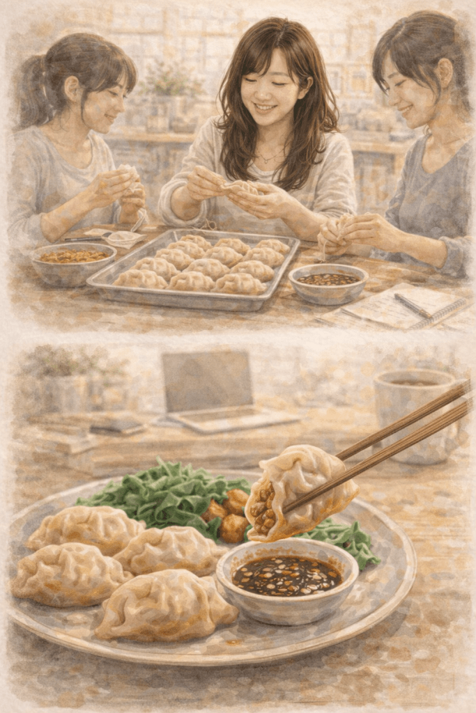You sit around a table, folding dumplings, chatting about life, work, relationships, whatever is happening that week. There’s something calming about the rhythm of it — scoop filling, fold wrapper, repeat.